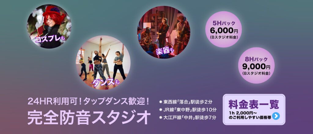新宿ダンススタジオailee(エレ)は、ダンスはもちろん楽器の演奏、演劇の練習やボイスサンプル収録など多目的に利用できるスタジオです。