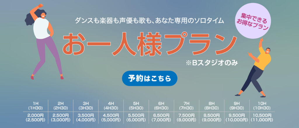 ダンスの方はカガミが2面あるので立ち位置を確認しやすいですし、三脚(スマホ対応)しているので自分たちのダンスを撮影できます。演劇では練習しやすいようにホワイトボードがABとも置いてあり、パイプイスが常設しております。声優をめざしている方は、防音スタジオなので音を気にすることなくレッスンできます。また、Aスタジオには録音ルールがございますので音がまったく反響することなく集中してボイスサンプルを録音することができます。パーティ利用したい方は貸切で利用できます。受付も開放いたしますので自由に利用できます。また、一人でしっかり練習したい方はお一人様料金を設定しております。1hあたり1000円です。振り付けなど集中して行いたいときなど防音なので周りの音に気にすることなく集中できます。またバレエのレッスンなどのときはバーもご用意しておりますのでお気軽にご相談下さい(別料金)。